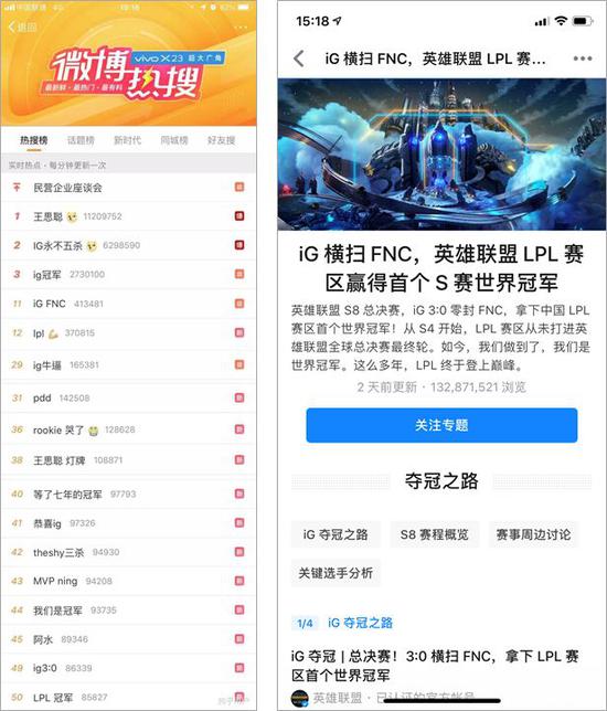 比赛结束后,IG夺冠的相关话题瞬间占领了微博的热搜榜,最高的#王思聪#搜索量达1000w+,配上鲜红的“爆”字,围观群众都感受到了火热。