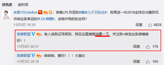 就在IG夺冠当日,《英雄联盟》官方微博就发布了庆祝IG夺冠给粉丝抽奖福利的活动。