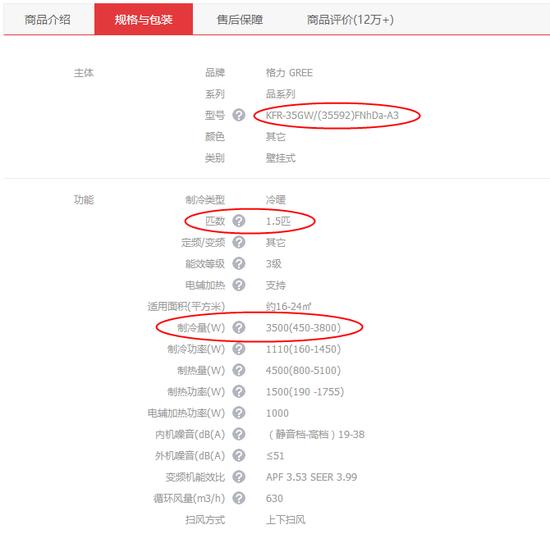 实际上空调的匹数就是指功率大小,也有叫马力的,再通俗一些讲,1匹、2匹……数字越大的空调,功率就越高,制冷速度也越快,耗电量也就越大。我们再以京东商城上的一款格力空调参数为例,看看这个匹数都与哪些参数相关。