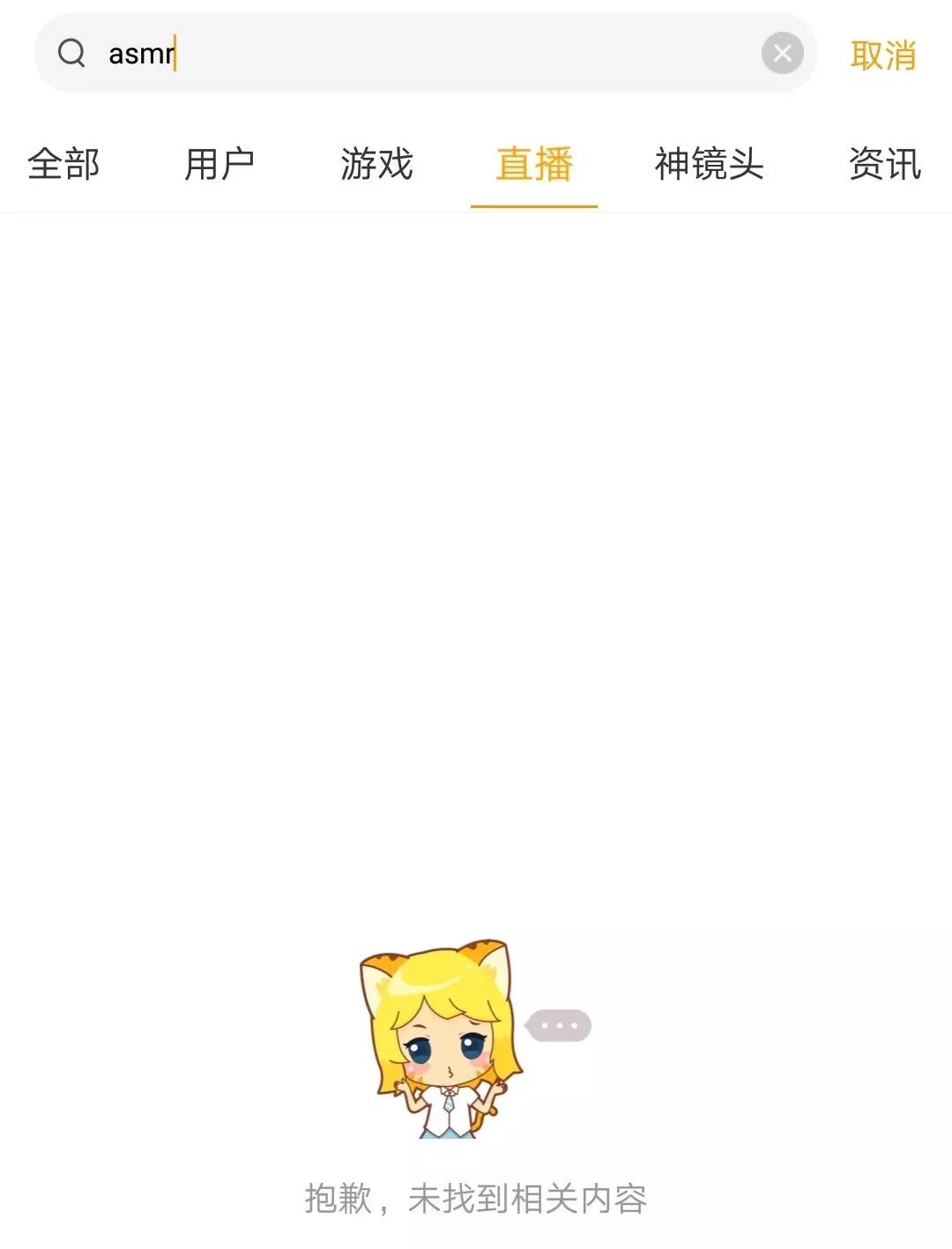 其中,虎牙旗下主播“轩子巨2兔”有着“ASMR第一女神”之称,但目前,虎牙平台搜索“ASMR”词条显示:无法找到相关内容。