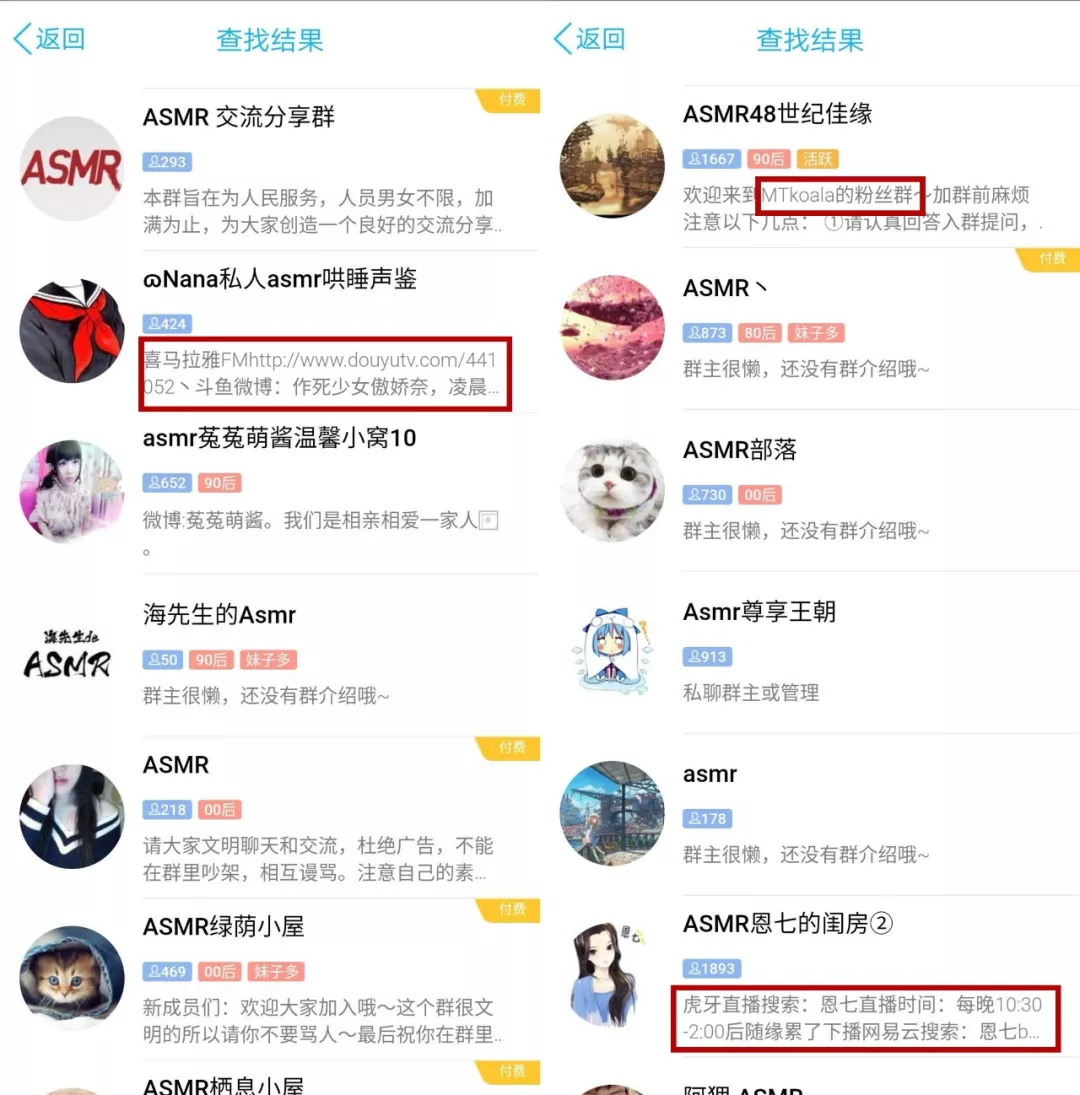 镜像娱乐(ID:jingxiangyule)通过在QQ搜索“ASMR”也能找到大量相关QQ群,其中不乏付费群,还有不少与直播平台相关联。