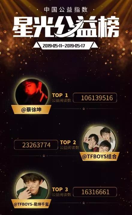 2019年5月,中国扶贫基金会宣布蔡徐坤成为减灾形象大使,就在当周,蔡徐坤成为中国星光公益榜榜首,公益阅读数高达1亿613万。