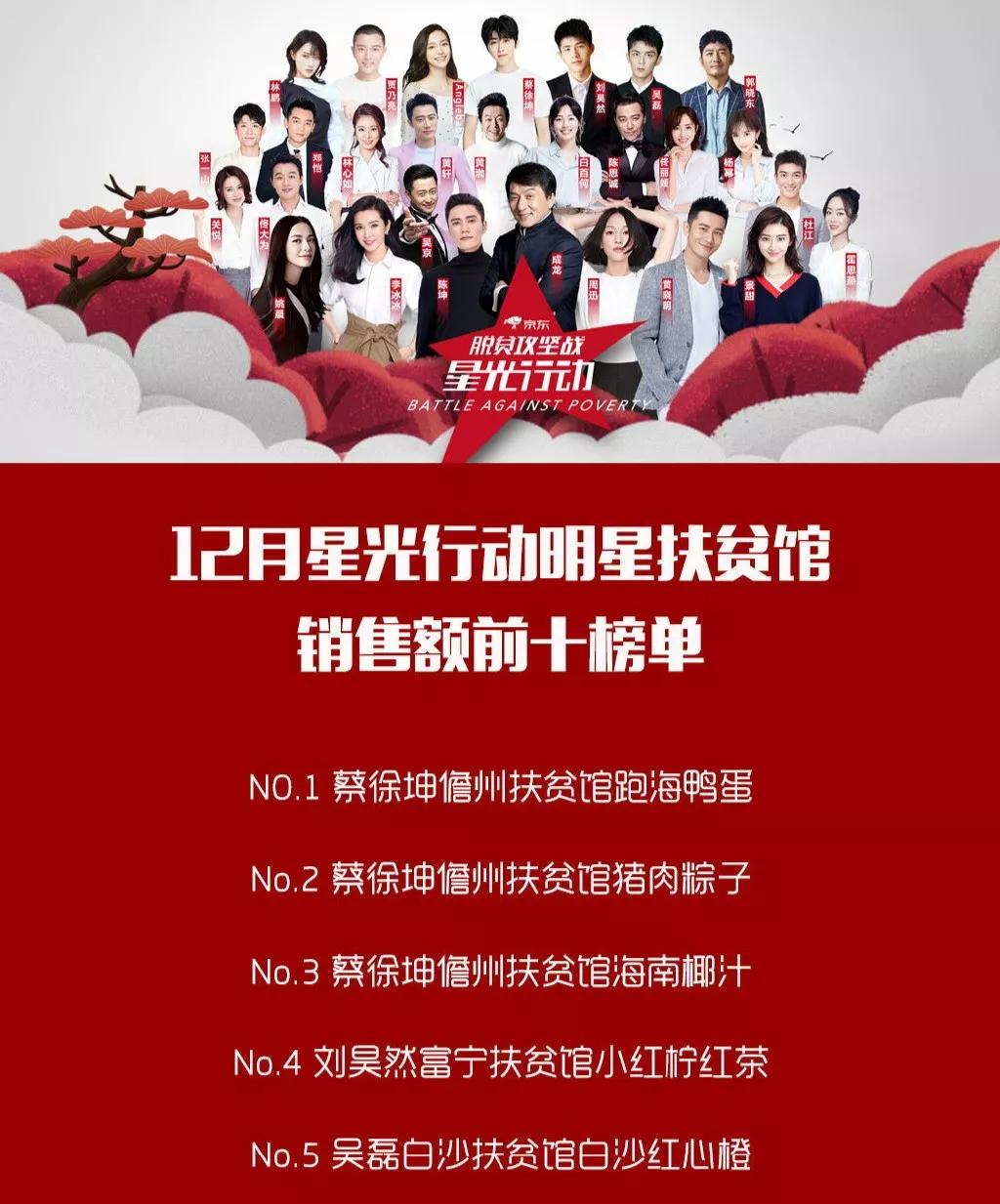 在2018年 “脱贫攻坚星光行动”中,蔡徐坤在海南儋州推销当地的特产“跑海鸭蛋”、猪肉粽子及海南椰汁并通过电商售卖,最终卖出了130万枚的鸭蛋,以一己之力占据了“12月明星扶贫馆销售额”的前三名;