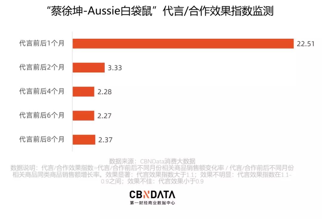 品牌方和粉丝联动的一系列营销举措也得到了非常惊喜的回报。我们监测了蔡徐坤代言白袋鼠发膜前后6个月的销售效果发现,在代言的第一个月内,品牌效果指数高达22.51,发膜销售额得到了断层式的暴涨。