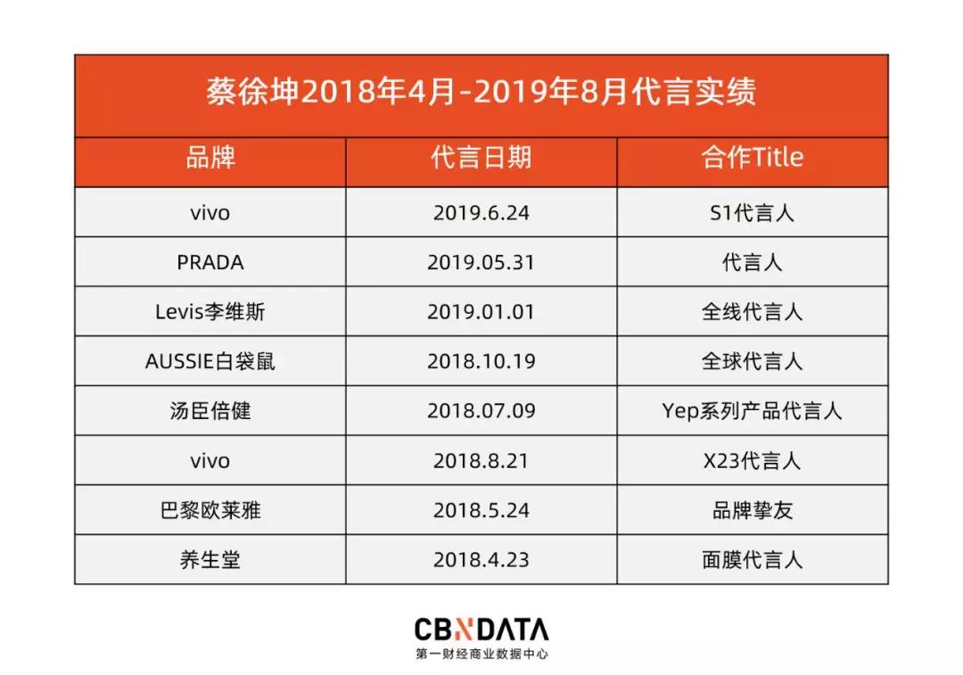 2018年4月6日,蔡徐坤从《偶像练习生》C位出道。一年多的时间,他总共合作过7个商业品牌,其中6个都是以代言人的身份,范围涉及美妆个护、服饰鞋包、家电3C等众多品类。