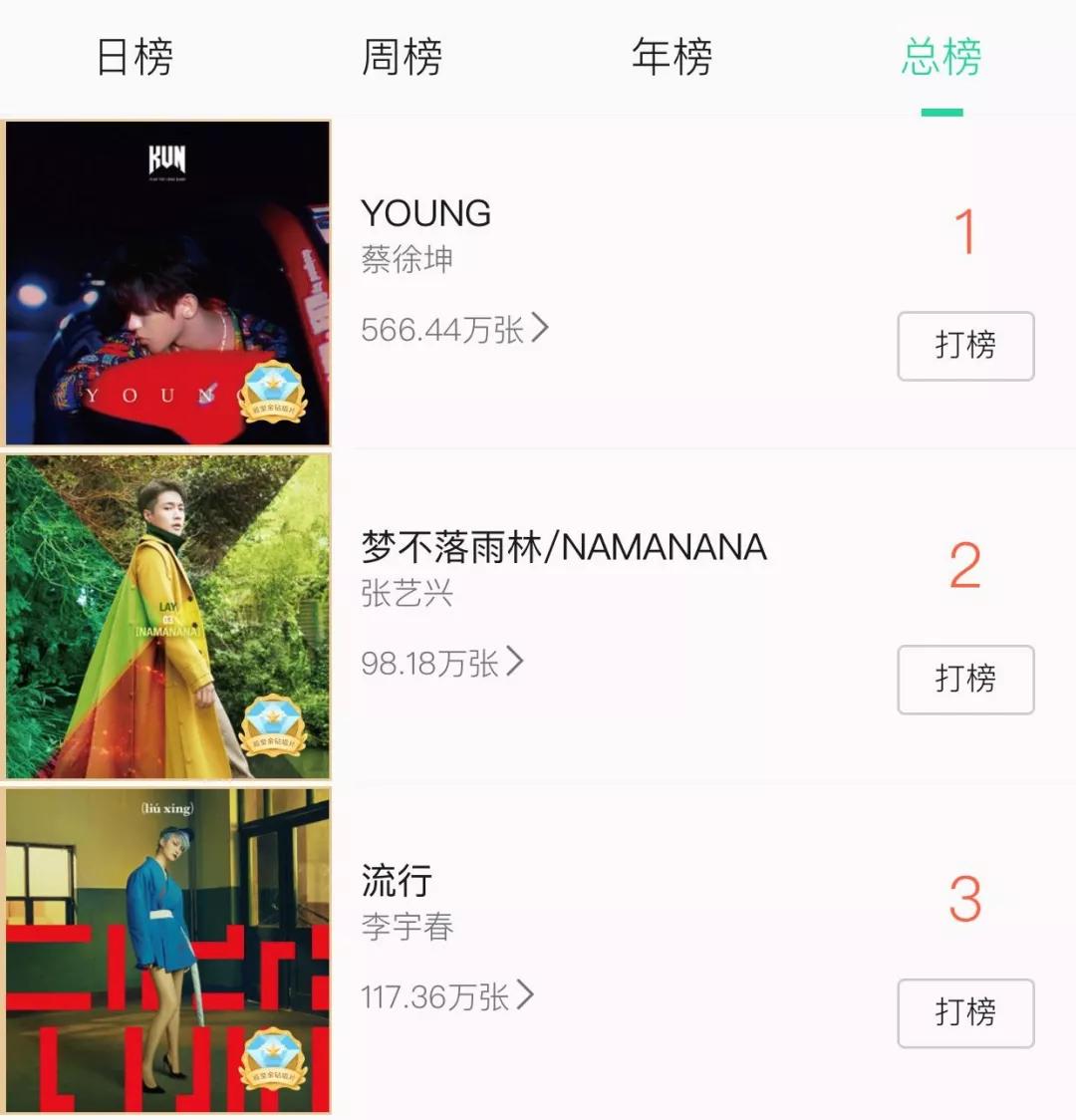 7月26日,蔡徐坤的新歌《YOUNG》发售,用时3小时22分钟成为QQ音乐总榜第一, 目前销售额破2900万人民币,就此打破张艺兴粉丝历时9个月创造的2600万的记录。