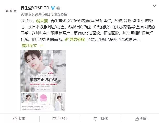2018年4月23日,蔡徐坤拿到了他的第一个面膜代言。开售两分钟售罄,不到两个月的时间,就卖到了1750万的销售额。