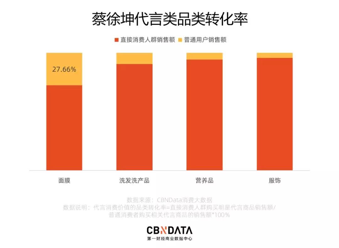 在蔡徐坤的代言品类中,面膜、洗发护发产品及营养品成为品类转换率前三。尤其是面膜方面,转化率约为总品类销售额的近30%。