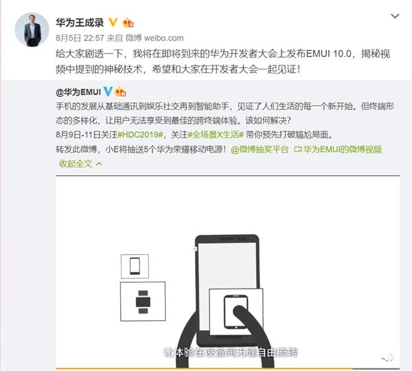 8月5日晚间,华为EMUI官方微博预告,华为将于8月9日-8月11日举行华为开发者大会,届时全新EMUI 10将正式亮相。