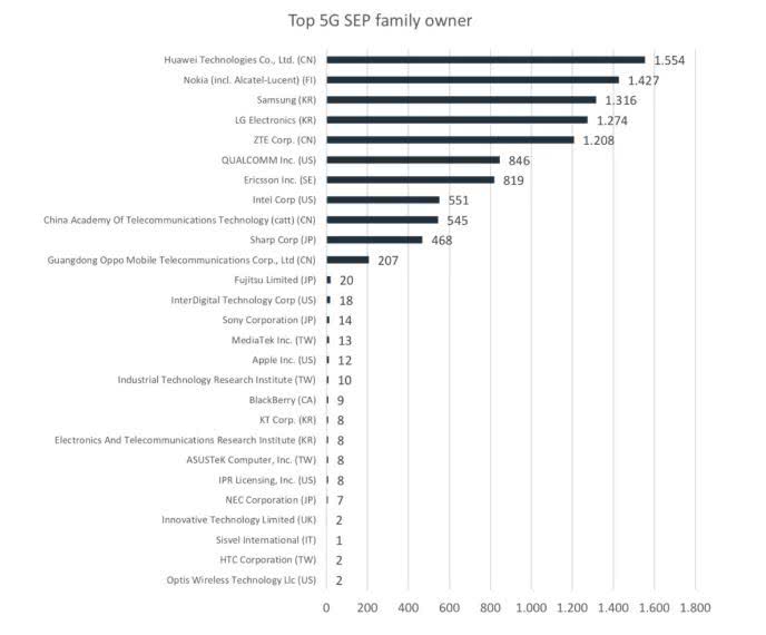 德国专利数据公司IPlytics发布的《5G专利报告数据》中显示,华为以15.05%的5G SEP专利占比排名第一,而中国企业总共占比34%。诺基亚以14%的占比排名第二,而爱立信则以8%排名第七。由于诺基亚和爱立信在研发实力和投入远不及华为,未来这一差距可能被进一步拉大, 5G专利数量在进入5G快速发展时期华为将占据绝对优势。