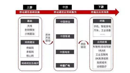 5G产业链的上游,主要是基站系统的铺设、包括网络架构的搭建,中游包括四大运营商的服务,下游包括各种终端产品和应用场景。具体见下图:
