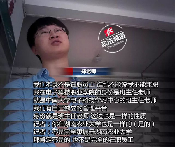 这名学校负责人记录了特攻记者反映的情况后,表示将展开调查。随后,记者从中南大学网络教育学院教学部负责人处了解到,该学院的确在湖南电子科技职业学院设立了一个学习中心,采取的合作模式是:学习中心负责招生,中南大学网络教育学院负责教学。