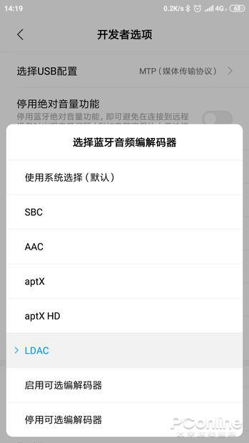 接着进入“开发者选项”,找到“蓝牙音频解码器”一栏,即可选择各种蓝牙音频编码器,例如SBC、AAC、aptX、LDAC等等。