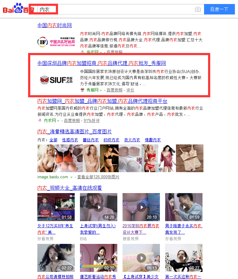 其二:我们在做SEO优化的时候,要对行业、关键词搜索出来的对手要有一个了解,做到知己知彼,方能对症下药!走吧!我们找度爷搜索下“内衣”一词,看看有哪些结果展示,如下图: