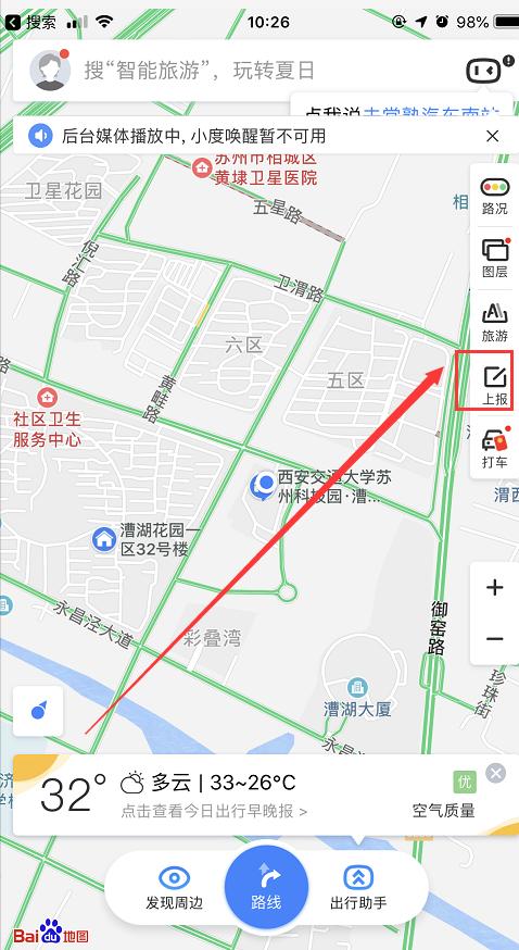 第一步,在应用商店里面下载百度地图这个APP,然后打开APP,点击右上角“上报”。