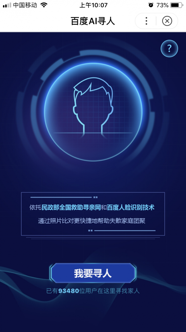 如今,技术改变了这一切。相关数据显示,2016年底民政部与百度开展合作,将百度人脸识别技术应用在救助寻亲工作,两年多时间里共进行20余万次人脸识别,实现6493次走失人员的成功比对。其中,通过“百度AI寻人”智能小程序进行的人脸识别共计有89219人次,累计上传照片94080张。其中,小程序的用户重复使用率较高,同一位用户会通过小程序进行多次寻人的尝试,这主要得益于智能小程序仅通过手机等移动智能终端就能方便使用的原因。借助百度App、百度贴吧、百度知道等产品组成的百度移动生态体系的巨大能量,百度可以通过用户画像和知识图谱让“AI寻人”智能小程序主动去触达有寻人需求的人群,更高效、精准地帮助潜在需求人群了解和获取寻人服务。