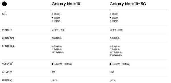 其他方面,三星Note10和Note10+国行版均搭载骁龙855移动平台,前者标配8GB运存,后者达到12GB运存,不过两款手机都是256GB版。后置摄像头上,三星Note10+比Note10多出一颗3D景深镜头,都前置1000万像素单摄。另外,Note10+的电池容量达到4300mAh,而Note10为3500mAh。最后,两款手机均提供莫奈彩、麦昆黑和密斯白三款配色。