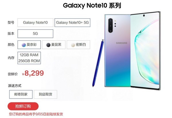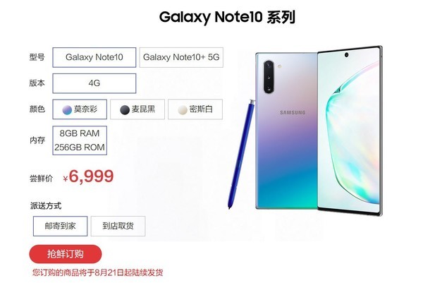 目前,三星Note10和Note10+ 5G版已经可以抢先订购,尝鲜价分别为6999元和8299元,按照以往的惯例,正式价格会比这个低一些。那么什么时候才能买到这两款手机呢?Note10将在8月21日开始发货,而Note10+ 5G版的发货时间为9月5日。