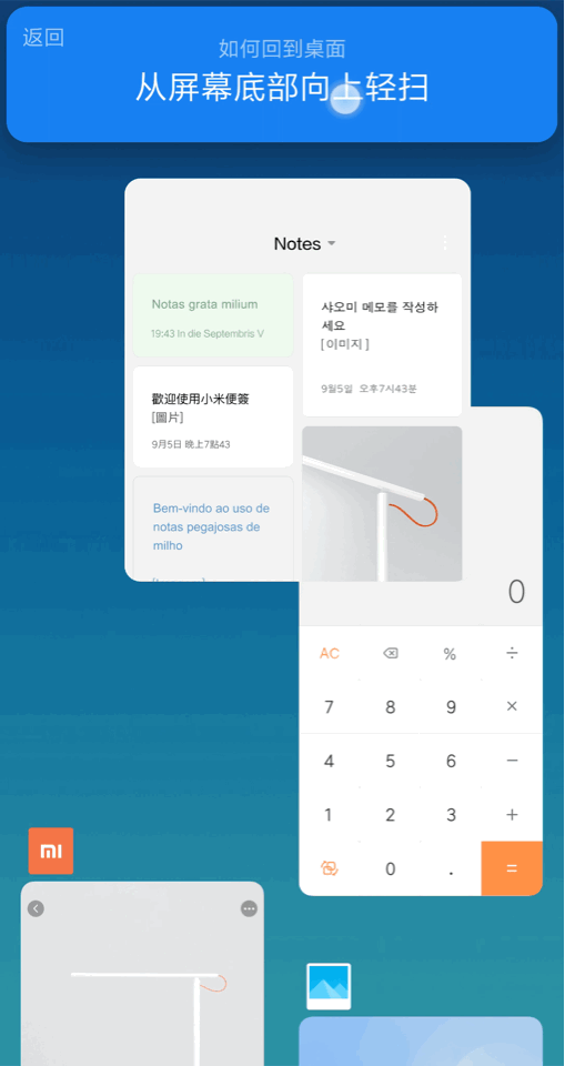 华为、小米和OV机型,都采用了自家的全面屏手势,而且一般都是默认开启。以小米为例,手指从屏幕底部向上滑动是回到桌面,上滑并停顿的话是进入多任务界面,从屏幕两侧向中间滑动则是返回上一级菜单。