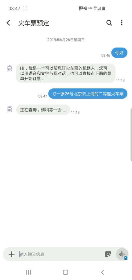 买火车票以后更加方便和智能,在短信界面中可以像聊天一样和服务平台完成对话,输入城市名、日期、姓名等信息,就能快速高效地完成订票。