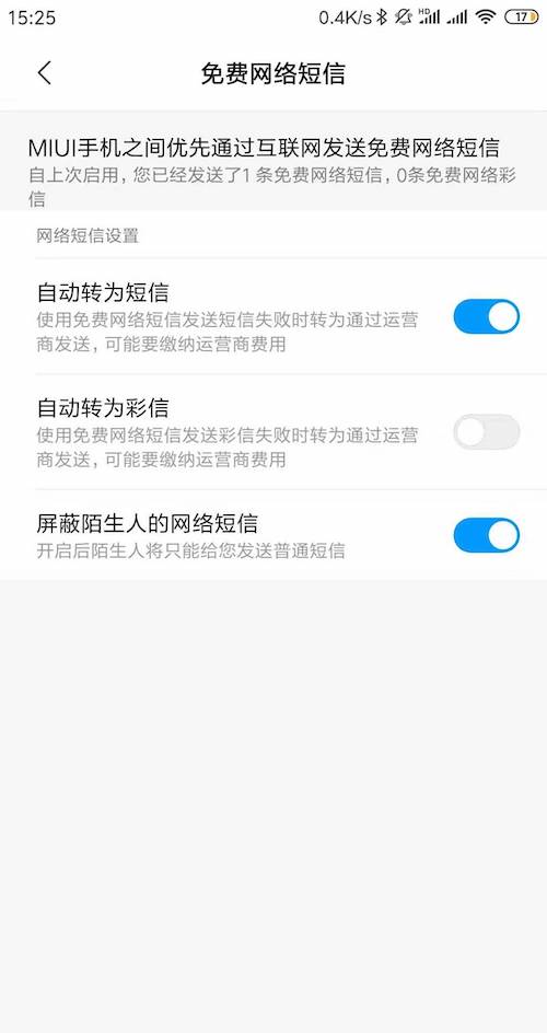 另外,小米手机短信应用中一直都有给米粉的福利——免费网络短信。它的原理和iMessage非常类似,如果双方用的都是小米手机,并且都处于联网状态,就能免费发送信息了。
