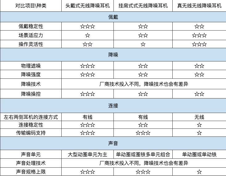 经过一系列详细对比,我们对头戴式、挂肩式和真无线三种形式的降噪耳机也有一些了解。