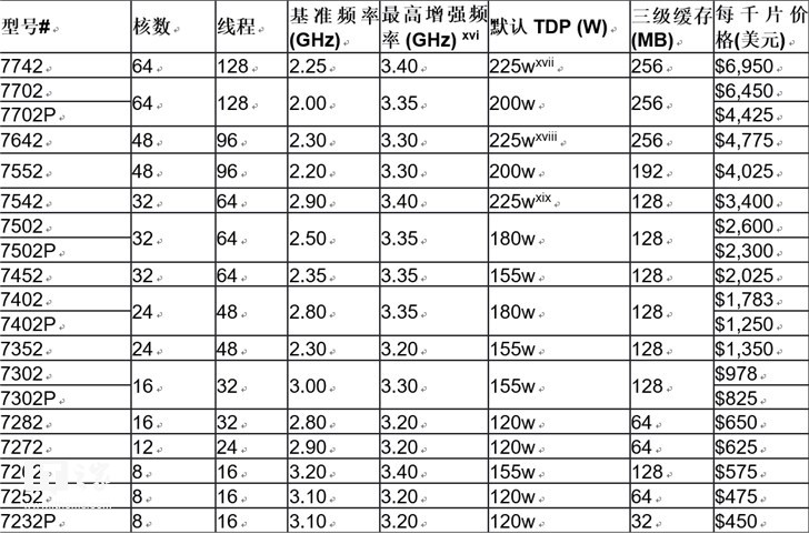 以下为AMD 7nm EPYC 7002系列处理器阵容: