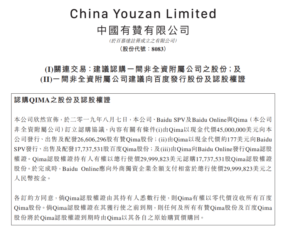 钛媒体8月8日消息:今日,香港上市公司中国有赞(08083.HK)发布公告称,中国有赞控股的实体获得一笔来自百度的投资。公告称,由Qima以现金代价4500万美元向公司发行、出售及配发2660.6万股有赞Qima股份;由Qima以现金代价约177美元向Baidu SPV发行、出售及配发1773.75万股百度Qima股份。本次百度投资金额约为3000万美金。