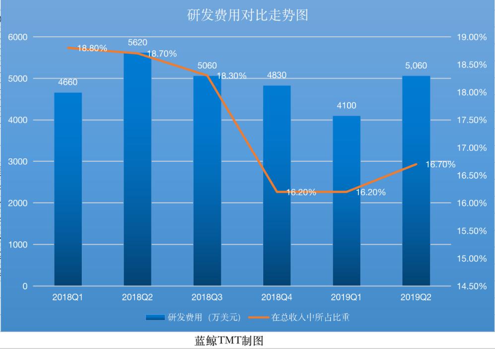 蓝鲸TMT记者注意到,目前只专注于以语音为核心的搜狗,或许是因为研发费用不足,不得不“轻装上阵”。为此,蓝鲸TMT记者对比了近六个季度的数据发现,搜狗的研发费用有缩减趋势,占总收入的比重也在平稳下滑。