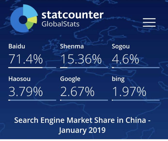 虽然背靠腾讯这座流量池,搜狗的市场份额仍不及百度,且差距较大。据statcounter数据显示,在2019年1月搜索引擎中国市场占有率中,百度以71.4%的绝对优势占据首位,神马搜索15.36%,而搜狗仅占4.6%。