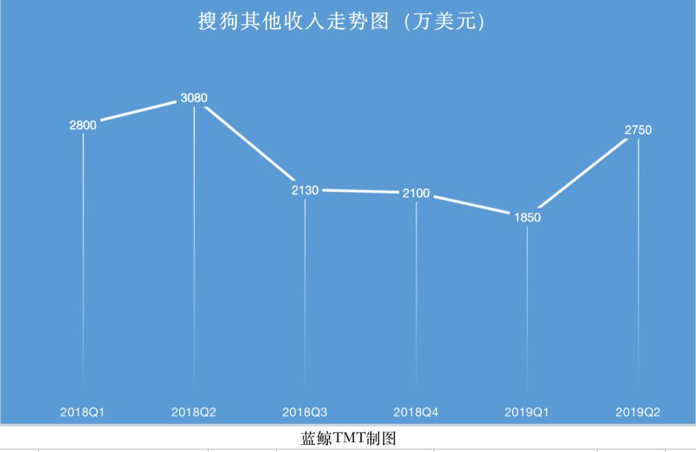 此外,搜狗第二季度的其他收入为2750万美元,同比下降11%。搜狗称,这主要是由于公司不断升级其智能硬件战略,导致智能硬件产品销售额下降。据蓝鲸记者统计发现,搜狗其他收入已经连续四个月处于同比下降状态,从2018年Q3开始大幅下滑后,便陷入持续低迷状态,本季开始略有回升。