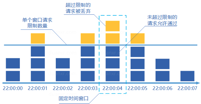 - 如果计数器超过了限制数量,则本窗口内所有的请求都被丢弃当时间到达下一个窗口时,计数器重置。