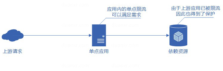 当应用为单点应用时,只要应用进行了限流,那么应用所依赖的各种服务也都得到了保护。