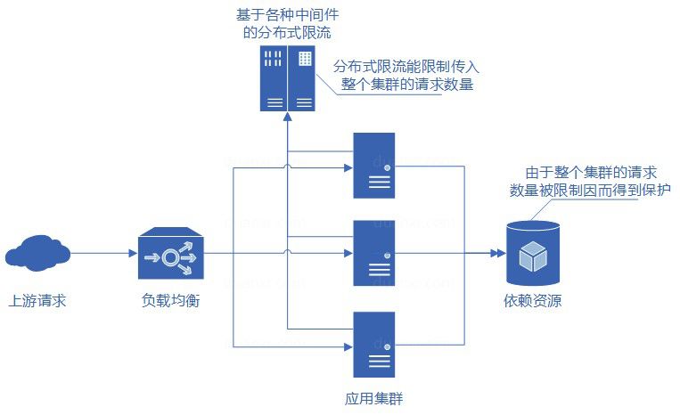 而如果实现了分布式限流,那么就可以方便地控制整个服务集群的请求限制,且由于整个集群的请求数量得到了限制,因此服务依赖的各种资源也得到了限流的保护。