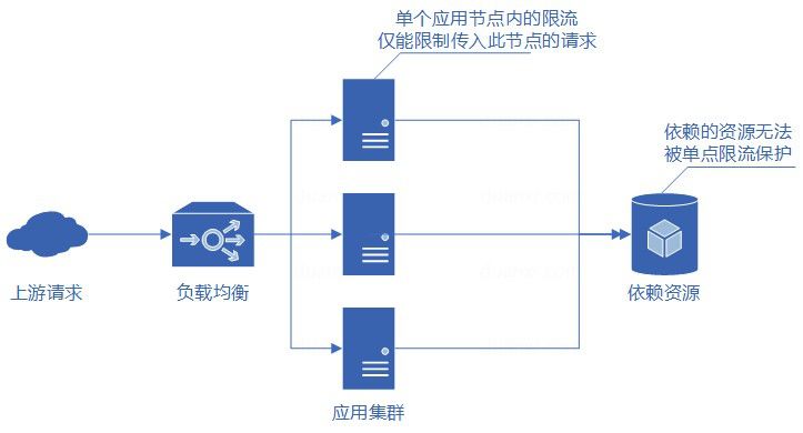 但线上业务出于各种原因考虑,多是分布式系统,单节点的限流仅能保护自身节点,但无法保护应用依赖的各种服务,并且在进行节点扩容、缩容时也无法准确控制整个服务的请求限制。