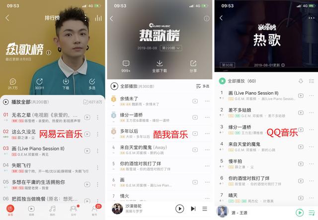 同样一个歌手,在QQ音乐、酷我音乐、酷狗音乐和网易云音乐上的人气会有明显不同;腾讯音乐和网易云音乐的歌曲榜单里,也完全不同。平台的主推内容不同,在用户端形成的口碑和感受也不相同。