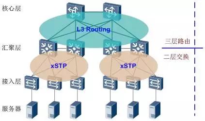 传统的数据中心通常都是二层+三层网络架构,接入层工作在二层、汇聚层向上提供路由能力、向下提供交换能力,核心路由层提供三层路由能力。