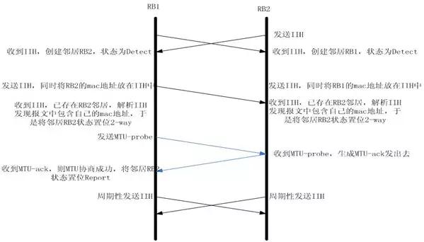如上图所示,RB1和 RB2同时互相发送IIH给对方,当各自收到对方的IIH时,都会将对方创建为邻居,此时的状态为detect,各自只检测到邻居存在,但是还没有握手成功,然后又互相发送IIH并将各自的mac地址放入在IIH中,当各自再次收到IIH时,解析IIH发现报文中包含自己的MAC地址,于是将各自的邻居状态置为2-way。然后只要其中一边发送MTU探测,各自都会收到都会收到MTU-ack,则MTU协商成功,此时各自的状态为report,然后周期性发送IIH。