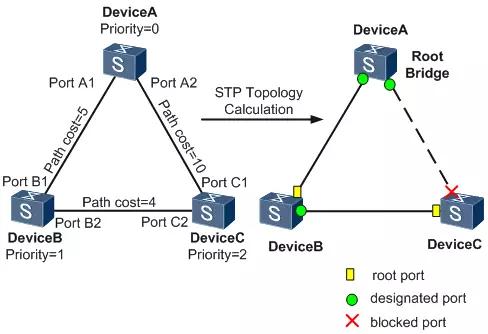 这种方法则是从广播风暴形成的根本原因入手防止环路出现,将冗余设备和冗余链路变成备份设备和备份链路。即冗余的设备端口和链路在正常情况下被阻塞掉,不参与数据报文的转发。只有当前转发的设备、端口、链路出现故障,导致网络不通的时候,冗余的设备端口和链路才会被打开,使得网络能够恢复正常。