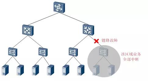 但是这种网络的可靠性是非常差,因为它没有任何的备份设备和备份链路,一旦某个设备或者链路发生故障,那么故障点下的所有主机就连不上网络了。