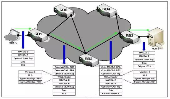 由RB组成的区域称为TRILL区域,当以太网帧进入TRILL区域,原始的以太网帧碰到的第一个RBridge - RB1,它把收到的帧打上一个TRILL头,并指定最后一个RBridge—RB3,该帧在该RB上解封装。RB1被称为“入口RBridge”,RB3称为“出口RBridge”。