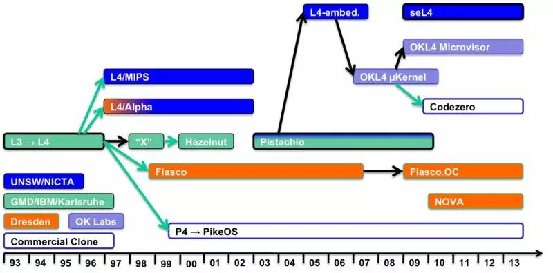 如此一来IPC功能部分的代码执行时间大大缩短;2. IPC不使用内存传递消息,而使用寄存器传递消息,同时限制IPC每次传递的信息长度,这样省去了对内存的访问时间。L4微内核的IPC速度经过测试要比Mach快20倍,这个令人惊讶的优化效果吸引了众多的目光,使微内核的研究重新火热起来。后面L4内核又发展出了很多相关系统,比如Pistachio,L4/MIPS,与Fiasco等等,这些内核组成了L4的大家族。