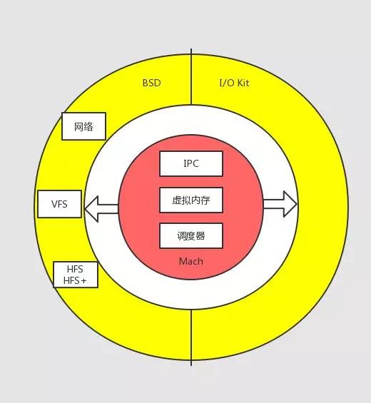 经过测试,Mach 2.5的效率最多比UNIX少25%,但是考虑到Mach带来的可靠性、可拓展性、安全性,这个效率损失尚可以接受。当然此时Mach内核还不算完全的微内核。而考虑到微内核可以更高效地利用多处理器计算机的处理器核心资源,人们期待着等Mach把系统服务都搬到内核之外后可以把运行效率损失降下来。同时Mach在微内核方面小小的尝试迅速吸引了大批公司与组织的注意,开放软件基金会(Open Software Foundation, OSF)宣布下一代系统OSF/1将基于Mach的内核, NeXTSTEP也将使用Mach2.5, 甚至IBM也打算利用Mach构建Workplace OS。苹果公司这个时候也出手了,苹果公司也从此基于Mach2.5打造其操作系统内核XNU,XNU的构成如下图所示,Mach作为内核的内环,外环右侧是苹果的驱动框架(I/O Kit),外环左侧是BSD的系统服务代码提供UNIX兼容的服务层,这三者共同协作向上层提供完整的系统服务。XNU广泛地使用在苹果公司的OSX,IOS等系统中。