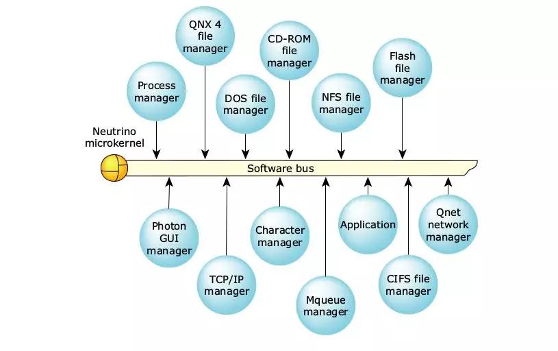 第二代微内核的代表除了有L4内核,也还有其他微内核比如Exokernel、Rambler等,不过商业上最成功的则是目前黑莓公司旗下的QNX系统所使用的Neutrino内核(QNX,1980年诞生,最初以QUICK UNIX为名,后改为QNX;2004年QNX被Harman国际收购;2010年Harman国际下被黑莓收购,QNX成为黑莓旗下的资产),QNX主要为高可靠领域提供解决方案,比如交通、能源、医疗、航天航空等。
