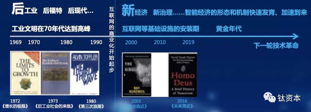 在互联网商业化开始前,大家对技术的关注更多是从经济增长的角度,从工业社会发展的角度,从技术浪潮的角度,到了互联网商业化越来越发达时,像《人类简史》《未来简史》《奇点临近》等书中新的一些思想观念和技术概念在互联网圈得到了认可,然后扩散到了传统企业家的认知圈里。