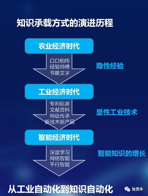 到了未来,智能经济时代关注的就是一种更复杂的知识传承的体系,不仅是通过人与人之间的关联,或知识机构和个体人间的关联,而是通过知识所创造的产品本身就能形成新的知识,也就是人工智能、大数据可能会创造一些新的经济模式,我们正在完成从工业自动化到知识自动化的过程,因为知识不再需要人作为主体和载体进行传播,通过数据本身就能产生新的知识。