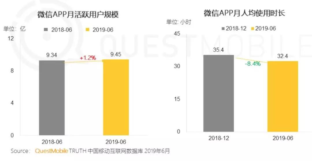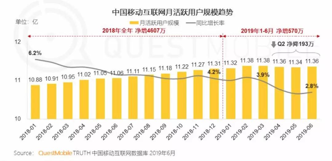 QuestMobile最新的数据显示,2019年Q2中国移动互联网用户净减200万,移动互联网用户出现首次负增长,从2018年12月到2019年3月,用户时长增速从22.6%降至11.8%,到了2019年6月,增速已经滑到了6%。