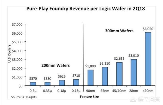 对于代工企业来说,所代工的芯片工艺要求越高,其代工的收入会越高。比如目前小于20纳米的芯片代工单张晶圆的代工收入大概是6050元,对于7纳米的晶圆,其代工收入应该在8000美元以上。