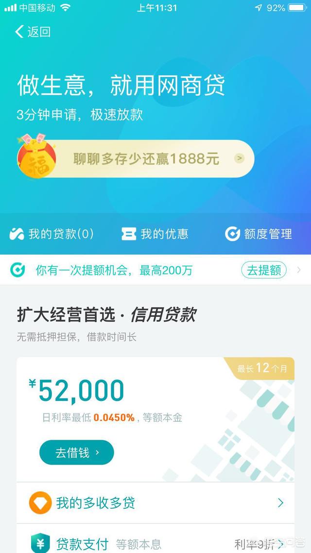 虽然,我的支付宝花呗额度不高,只有4000元!但是,支付宝却大大提高了我的网商贷额度,我的网商贷额度有52000元!