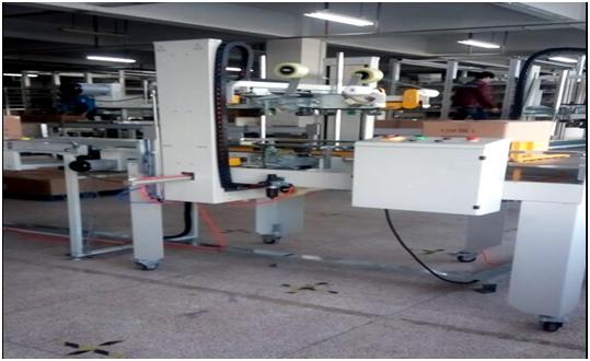 人工装箱, 开箱机开箱,装完后的箱子经下坡皮带机汇入主线,合箱机合箱,封口机封箱,